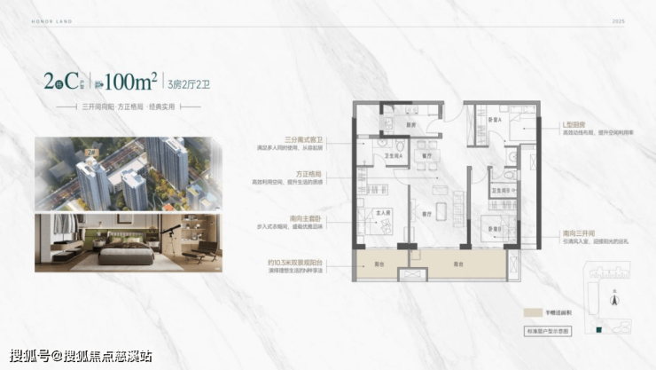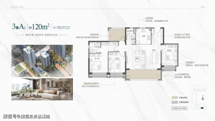 项目主打LDKGB一体化设计,6.2米全景阳台引景入室,短进深、长面宽创新布局实用率近100%。南北通透方正格局、全明采光覆盖。120㎡(建筑面积)做到3+1房2厅2卫户型,真正实现小户型大功能。
