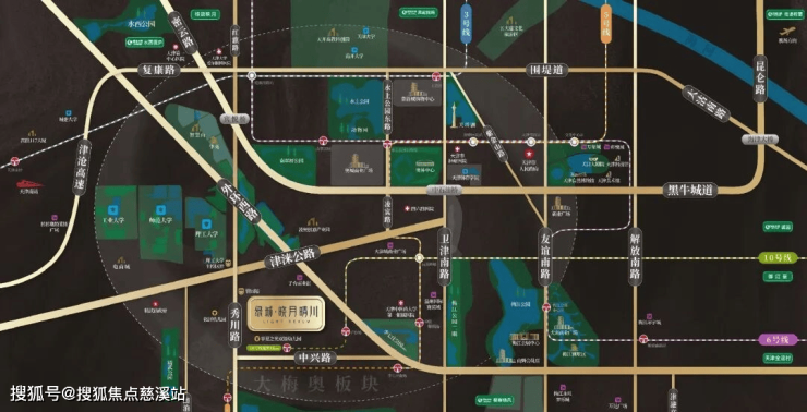 • 立体交通路网-驾车可通过津涞公路、外环线、卫津南路三条主干道到达梅江、奥体、银河三大商业板块。通过秀川路和津涞公路到达华苑、大学城板块。