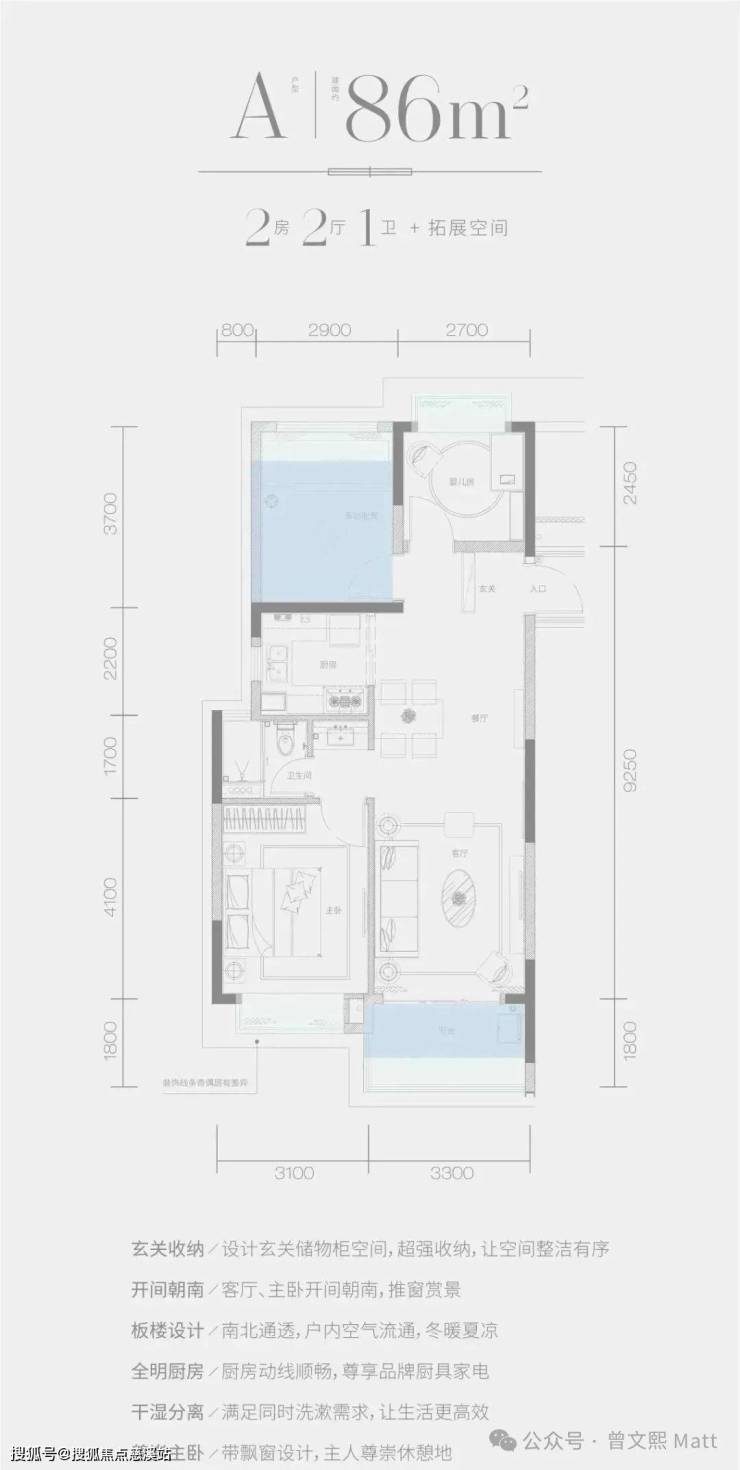 A 户型 —— 建面约 86㎡ 2 房 2 厅 1 卫 + 拓展空间。