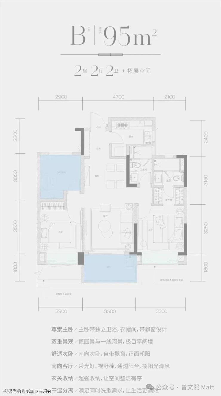 B 户型 —— 建面约 95㎡ 2 房 2 厅 2 卫 + 拓展空间。