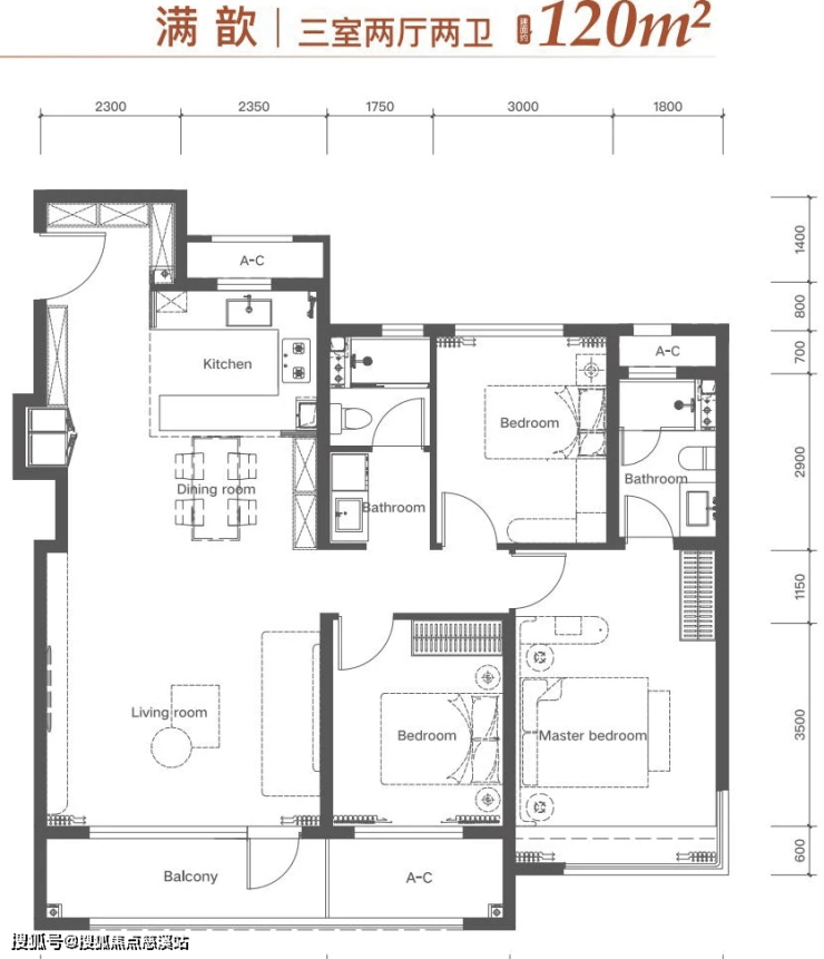 客厅延伸出去的阳台相当于连接了次卧的设备间赠送,演变成一个大阳台,像100㎡户型阳台就可以做到6.6米;120㎡就是7.7米。