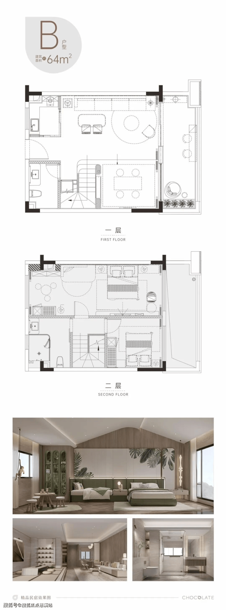 B: 64㎡(使用面积约125㎡),四房二卫户型