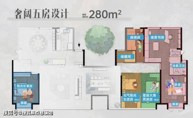 超配大五房的设计同样饱含诚意,每个房间的尺度格局都非常可观。长辈起居室与主卧分立一方,满足家庭成员不同的生活习惯,即便是早出晚归的工作节奏,也不必担心打扰家人的休息;双儿童房南向布局,让孩子可以在阳光中快乐成长。此外,户型还单独规划了保姆房与储藏间,拓展高阶人居功能需求。
