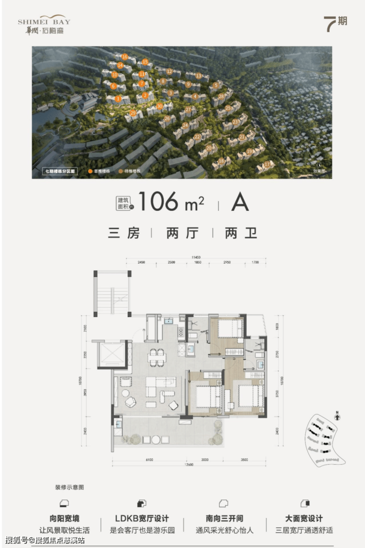 亮点:南向三开间,大宽厅设计通透舒适;花架可改为阳台;预留阳台及花池结构可改为北向卧室;客厅预留可变空间,可根据需求由3房变为4房。