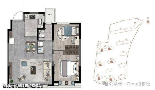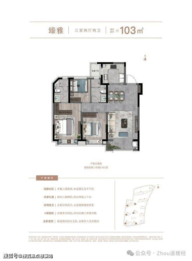 户型特点:类「1T1」电梯配比;南向三面朝阳;阳台预留上下水;全明双卫;U型厨房