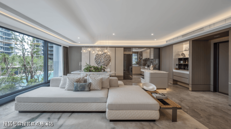 其中约143㎡B1户型做到4房3卫,三卧室朝南,采用约7米面宽的客餐一体横厅,动线清晰流畅。客厅背景墙处舍弃常规大理石材料,采用米白色系岩板来升华空间整体格调,既不会过于刺眼也不会显得沉闷,给人一种平静舒适的感觉。客厅采用超大落地窗,确保了开阔的视野与充足的自然光线。独立的岛台和mini bar不仅丰富了客厅的功能性,其独特的导光板材质也为房间增加低调的奢华气质。