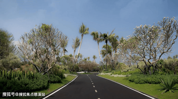 庄园主入口设置超大雨树植物,并点缀多重沙生植物,起到隐奢昭示的作用;从主入口到核心区以一条蜿蜒的车行道抵达,道路两侧精心挑选的32棵岛内原生大雨树,形成如林的夹道空间,提升人与空间的对话——轻松、度假、野奢、舒适。