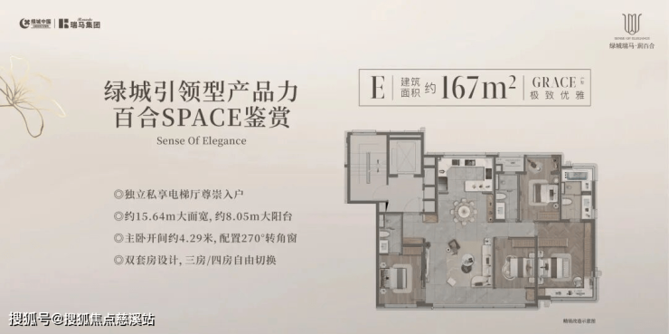 167㎡三/四室:私享电梯厅;约15.4米面宽,约8.05米阳台;主卧开间约4.29米,270度拐角窗;双套房。