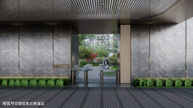 地块东侧的人行出入口,巧妙地结合中式格栅元素与现代门厅美学,打造屏风般的出入口,颇具东方风骨。