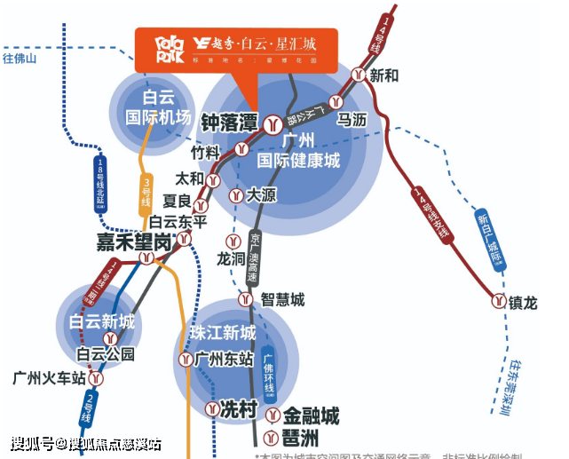 项目位于地铁14号线钟落潭站旁,5站到嘉禾望岗,换乘2、3号线可直通白云新城和畅达广州全城;