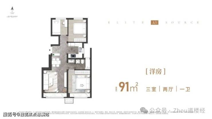 91㎡通透三室一卫全明户型