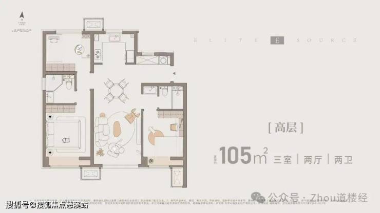 边户105㎡通透三室两卫全明户型,总价380-390万左右