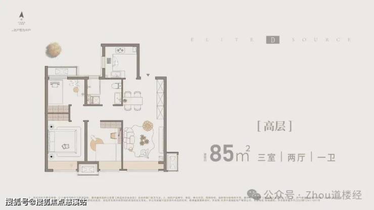 中户85㎡通透三室一卫全明户型,总价310-330万左右