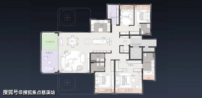 以项目约230㎡的户型产品为例,餐客厅为时下流行的大横厅设计,但以往的横厅户型,会与起居或功能空间放在一起,牺牲掉部分私密性。