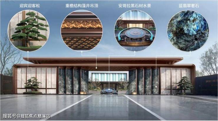 社区大门立面主要采用蓝翡翠奢石、云朵拉灰石材、仿铜拉丝不锈钢等材质,细节上呈现出现代精致的特性,透出轻奢的质感。