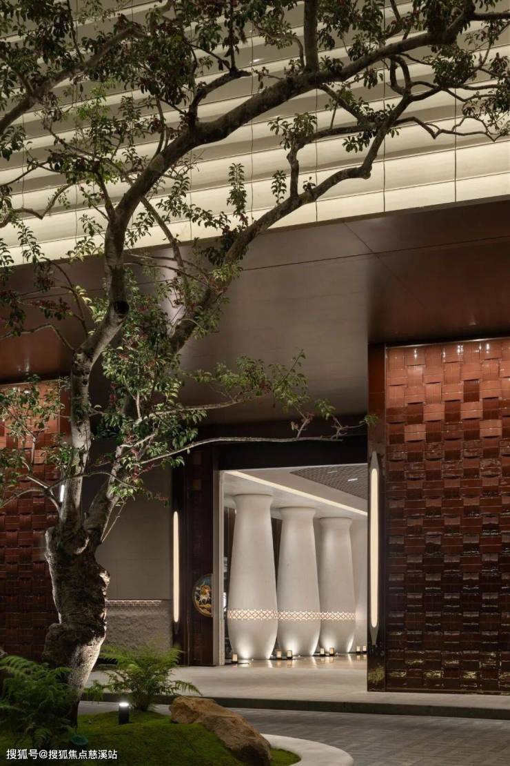 大门翼墙上的绛红色陶瓷,不仅是做了精心的色彩渐变,而且专门烧制了竹编的肌理。门内游廊上的「鱼篓」,也都是高奢酒店级的设计颗粒度。