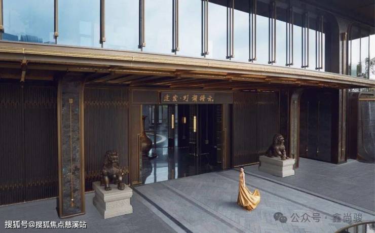 12.6米高,49.8米宽的外立面嵌入3吨重的电动铜门,回纹和仿铜不锈钢相结合,金属拉手融合玉石、灯光一体定制——雍容华美,气度万千,一眼万年。