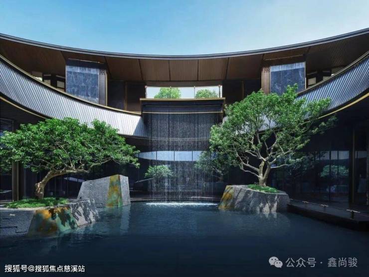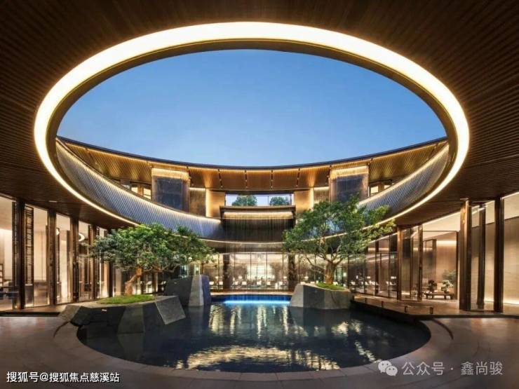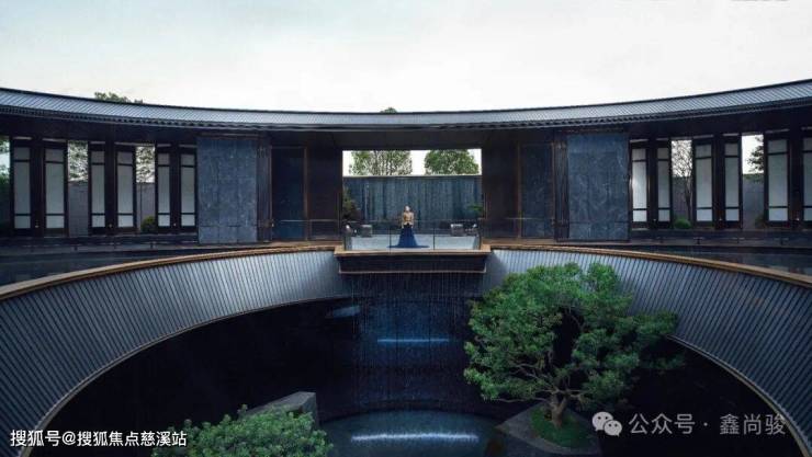 穿过大门,便看到豁然开阔的下沉庭院水景敞开怀抱迎接您,顶部为圆形,地面为方形,灵感源于“天圆地方”的设计理念,寓意阴阳平衡、动静互补。