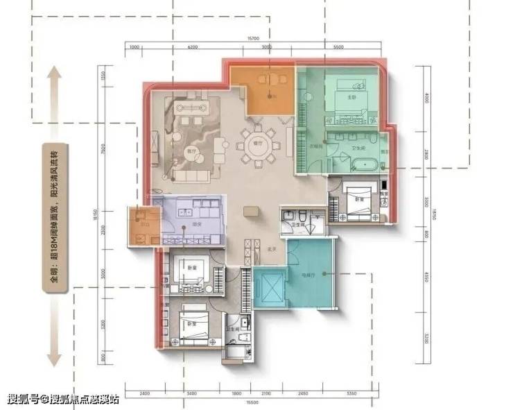 160㎡A2户型,该户型为东向景观阳台,最大卖点阳光充裕,三开间朝东,面宽约16.55米。