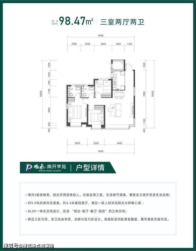 约98.47㎡三居,南向三面宽,约9.9米南向总面宽,约4.4米奢阔宽厅,更懂生活的优雅,满足一家人的沐浴阳光与舒畅心静,双卫设计,生活细节满满。