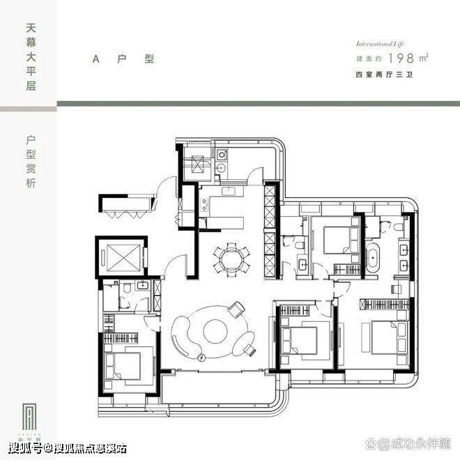 建面约198㎡四房户型,南向四开间,约9.35m观景阳台连通客厅和角落的卧房,约6m大横厅设计,LDKB一体化布局,将厨房空间彻底释放,和餐客厅完全融为一体,带来更直接的采光和空间体验。南向三卧室都自带卫生间,主卧带衣帽间,且有270°转角飘窗,视野更开阔。