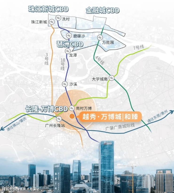 地铁线路交汇:周边有地铁 3 号线、7 号线、18 号线等多条轨道交通线路交汇,如从项目步行至南村万博站约 1.2-1.3 公里 ,可便捷到达琶洲、珠江新城等地