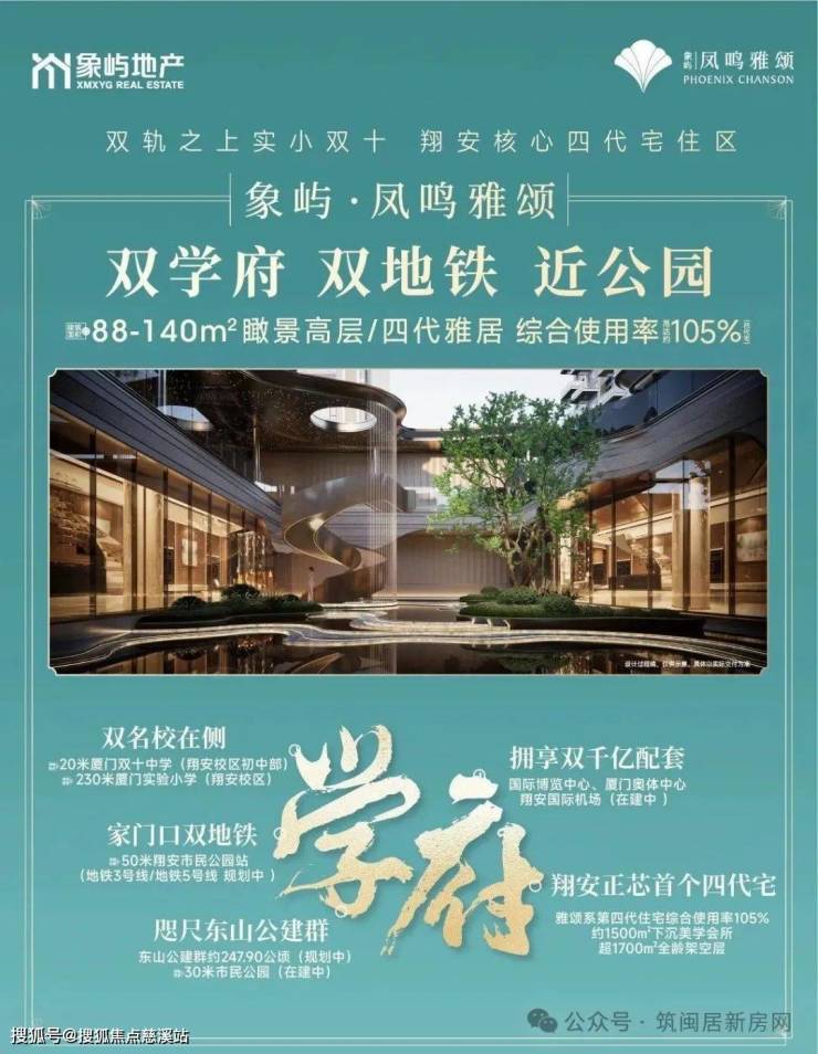 :项目规划 4 栋高层、3 栋洋房,共 614 套房源,容积率 3.02,绿化率 30%。象屿·凤鸣雅颂是象屿地产继上海天宸雅颂后的第二座【雅颂系】高端改善作品,也是翔安首个第四代生态住宅项目,主打“学区+品质+生态”的复合卖点。