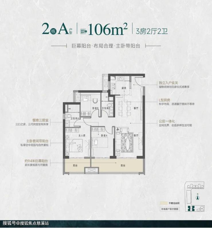 106 ㎡三房:南北通透双阳台,U 型厨房带双开门冰箱位。