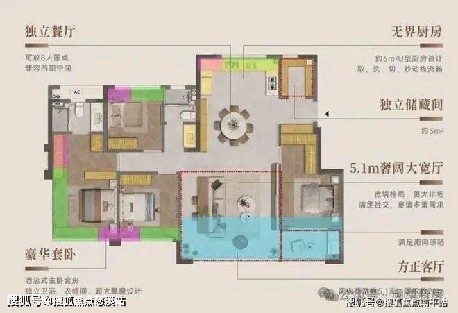 首先是入户下移,不再影响餐厅,餐厅也有了完全独立的空间,客餐厅做到完全的南北通透,次卧有了一个独立卫生间,虽然是暗卫。