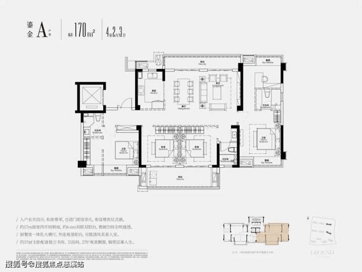 大师意志,艺术起笔。大师样板建面约150㎡特邀美国《室内设计》全球酒店室内设计第一的CCD香港郑中设计事务所操刀设计,两梯两户独立玄关,私享入户仪式,近46㎡LDKB一体化横厅,承载峯层家庭更多欢聚场景。约6.3米南北双阳台,配置约5.8米巨幕落地玻璃,四季美景揽入室内,近19㎡主人奢享套房,自成天地,尽显格局与尺度。大师样板建面约150㎡实景倾呈,诚邀藏家鉴赏。
