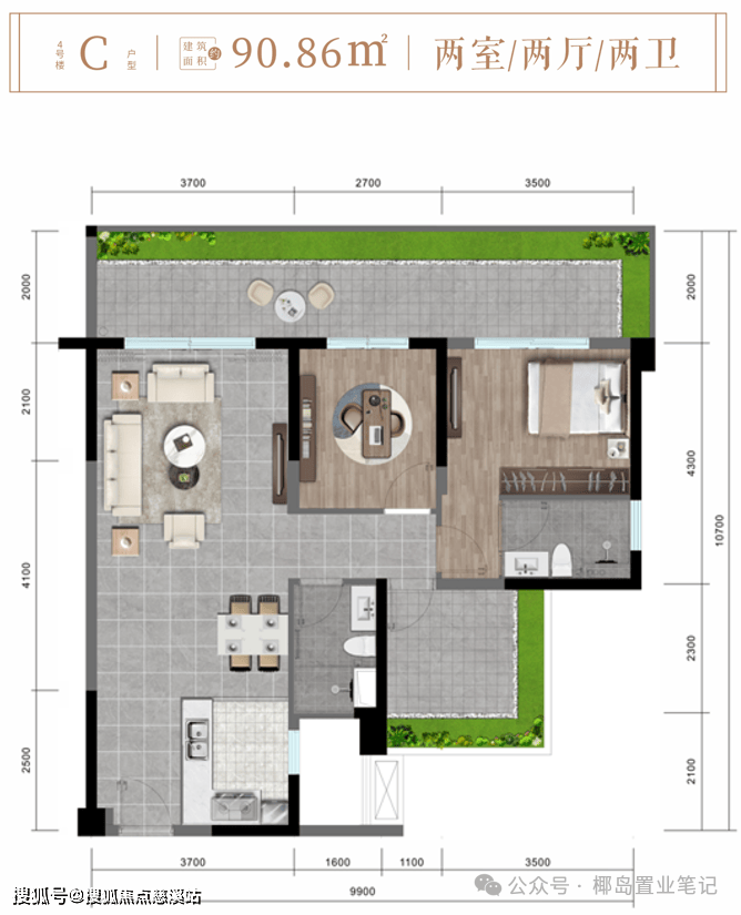 ✨4#楼C户型约90.86㎡两房两厅两卫