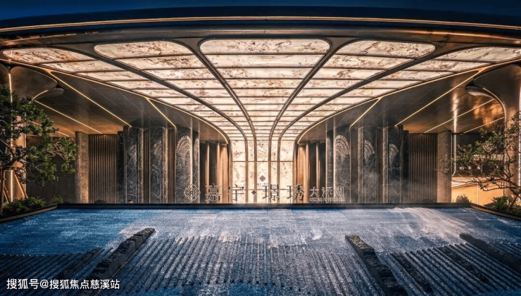 项目以近70米宽弧形顶盖、约9米挑高空间,结合景墙一体化延伸,构筑约120米的超级展示界面,远超当前市场。大门正中采用透光云石板,营造梦幻光影;前方设置“百舸争流”艺术景观,溯源湖湘,以现代手法演绎门第仪式。