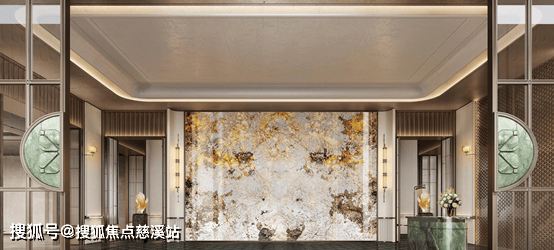 酒店式门厅选用孔雀开屏发光玉奢石背景墙,搭配绿野仙踪、太古黑金、布鲁诺灰等多类奢石,打造造价逾8000元/㎡的视觉焦点,呈现流光溢彩的归家序章。