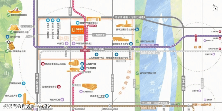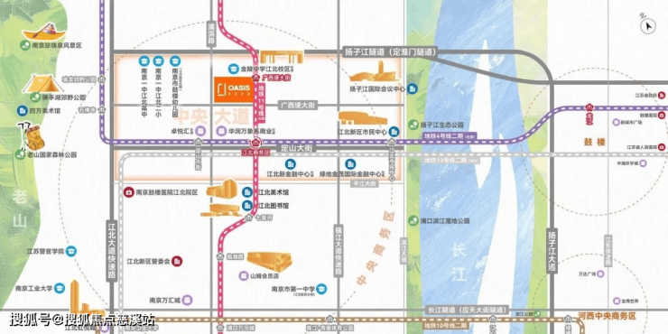 位于江北新区核中核,浦滨路和广西梗大街交汇处;紧邻【11号线】广西梗大街站(在建);近邻【4号线】江北商务区站(在建);距未来黄金主轴一一定山大街(预计2026年开街)直线距离仅约500m;