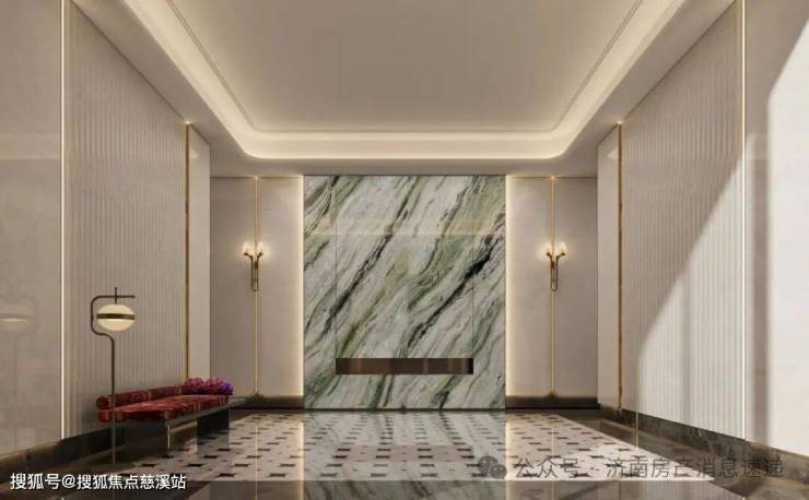 从社区大门进入是社区大堂,映入眼帘的是青玉铺设的地面,高奢、清雅