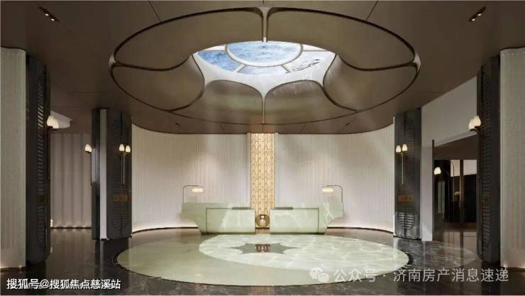 项目的大门两侧为巴西白金石打造石景墙。入口地雕直径约 6.8m,选用库班绿、云黑石、铂金钻三种贵石材与铜板相搭配,整体精致、奢华