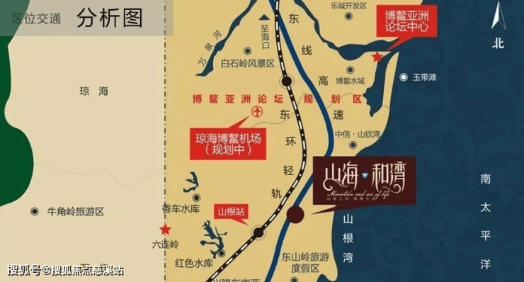 山海和湾位于海南省万宁市山根镇,属于博鳌亚洲论坛规划区,占据博鳌南大门的咽喉位置。距离博鳌机场仅18公里,我们的项目是位于海口和三亚的中心的位置,距海口仅116公里,距三亚仅118公里,乘坐东环轻轨仅50分钟的车程。