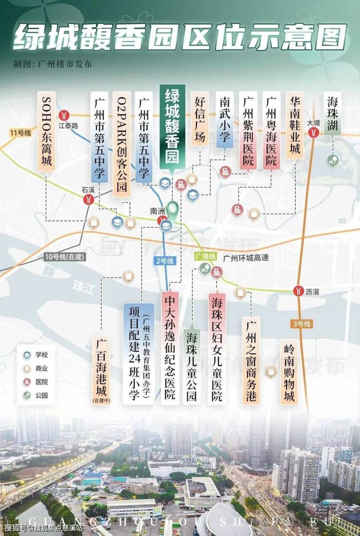 位于广州海珠区海珠湾心地带,紧邻地铁 2 号线和广佛线的换乘站南洲站,东邻繁华的珠江新城,西靠广佛线,遥望广州塔、海心沙等知名地标