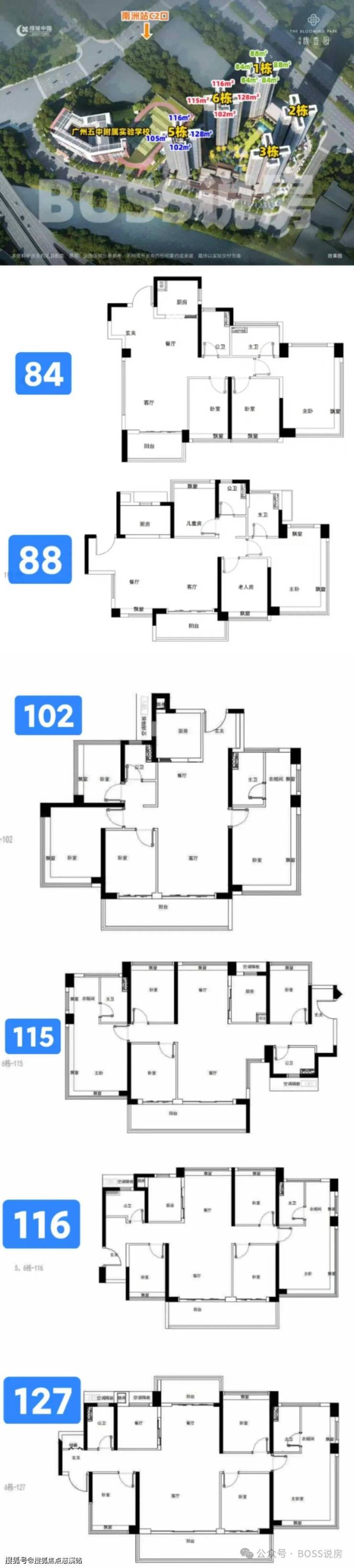 主力户型为 84/88/102/115/116/127㎡的三至四房产品,另外还有4套200m²顶复,四房户型占据了项目的 80% 左右,每个户型的使用率可达 125% ,相当高效合理。
