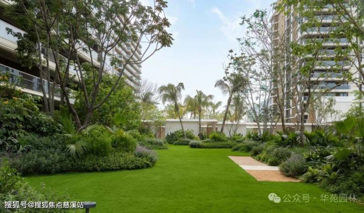 以雨树垂落丝绸质感的荫翳为基调,两侧银海枣的羽状叶鞘轻轻切割天光,漏下满地跳动的光斑。车行道上,丛植的鸡蛋花于光影交错间亭立,以舒展的树形与清雅芬芳,为归途铺垫宁静的仪式感。大地形如绿屏半掩,将建筑化作屏风后的山水卷轴,只在林隙间透出鎏金门头的惊鸿一瞥。