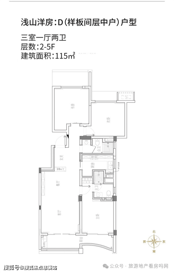 浅山洋房:D(样板间层中户)户型:三室一厅两卫,建筑面积约115㎡。阔绰开间客厅南北通透,舒适享受,与阳台相连,引阳光与清风入户;餐厅位于厨房一侧,完全干湿分离,不干扰起居空间;主卧独立卫浴设计,连通阔景阳台,幸福度指数高。