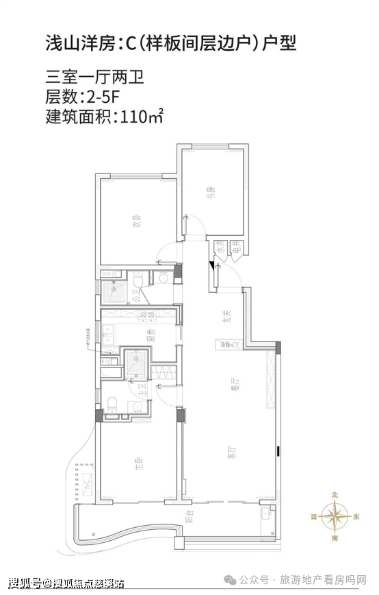 浅山洋房:C(样板间层边户)户型:三室一厅两卫,建筑面积约110㎡。户型方正实用,动静分区,千湿分离,功能布局科学合理;厨房毗邻玄关,美食一步到位,全明设计,享受更多清朗空间;宽大客厅,方正实用,南北通透空间,惬意悠享假日生活。