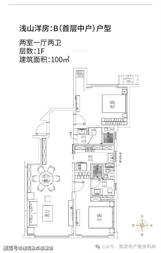 浅山洋房:B(首层中户)户型:两室一厅两卫,建筑面积约100㎡。该户型方正,布局紧凑;南侧开阔阳台,连通客厅与主卧,俯激窗外,浪漫生活被美景包围;主卧套房设计,带独立卫浴,私密性强;北侧卧室带飘窗,公卫在侧,生活起居更惬意。