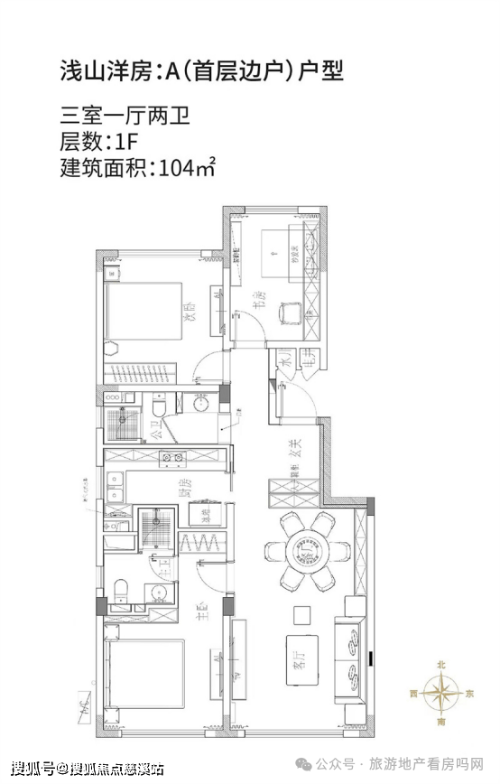 浅山洋房:A(首层边户)户型:三室一厅两卫,建筑面积约104㎡。该户型南北通透,功能齐全;主卧朝南,享受无边无际的阳光美景,北侧书房宁静舒适,心情抒怀;阳光厨房,视野极佳,方正实用;客餐厅一体,与景观阳台相连,舒适生活。