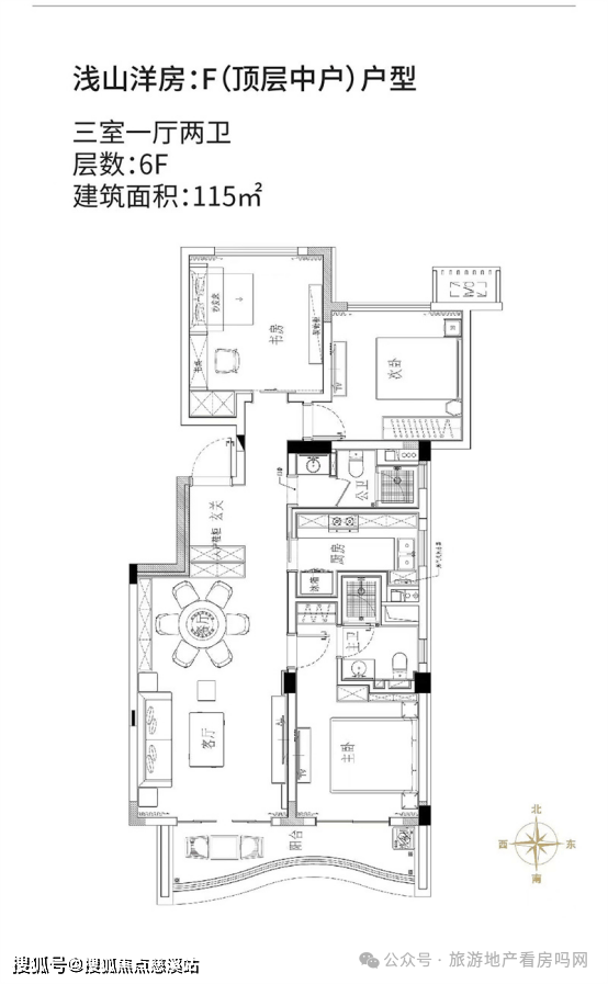 浅山洋房:F(顶层中户)户型:三室一厅两卫,建筑面积约115㎡。主卧朝南,享受更多阳光和园林景色,北侧书房可改卧室,尽纳空间无限可能;大面宽客厅与餐厅一体,方正通透,尺度阔绰;双南面观景阳台,尺度舒适,客厅卧室均亭受诗意栖居。
