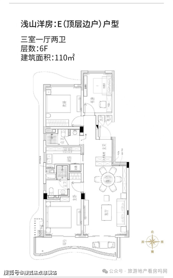 浅山洋房:E(顶层边户)户型:三室一厅两卫,建筑面积约110㎡。入户玄关设计,北侧书房与次卧带飘窗,通风采光好;独立L型厨房带明窗,健康生活;客餐厅一体,与南向景观阳台无缝衔接。