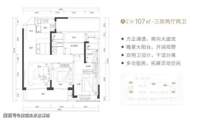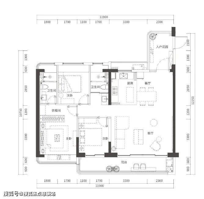 动静分区,三个卧室+公卫都位于餐客厅一侧,主卧带步入式衣帽间。
