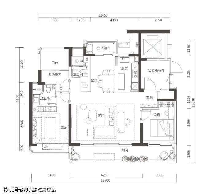 C户型为飞机户型,电梯独立入户,南北双阳台,约6.25米大横厅设计,采光通风效果好,主卧和次卧位于客厅两侧,避免两代人生活干扰。
