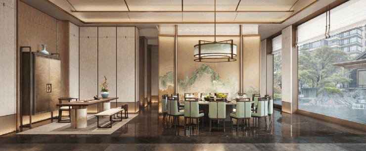 在园林的呈现上,以《千里江山图》丰富的场景为灵感,创新打造水景、叠水、凉亭,辅以奢石名木,重现宋代生活的闲情逸致。项目复刻宋代连廊结构更是一绝,实现全域覆盖的风雨连廊,从容衔接每一处生活场景,即使阴雨时节,亦可悠然其中。