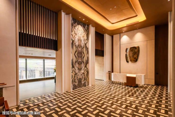 门楼大面积选用高端石材贝金米黄,常作为奢华酒店室内装饰材料;大门腰线饰以非洲蓝翡翠奢石,由原产地非洲马达加斯加进口,因其独特的颜色和稀有性,常被用于高端品牌珠宝设计中;大门中央是非遗工艺纯手工锻打的仿紫铜照壁,融合东方意境与现代美学;落客区透光云石吊顶与定制紫铜大门,铭刻归家专属仪式感。